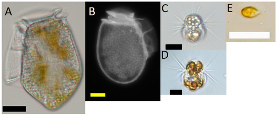 - Naustvoll, L.J. Prey size spectra and food preferences in thecate heterotrophic dinoflagellates. Phycologia 2000, 39, 187–198. [Google Scholar] [CrossRef]