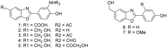 Nocarbenzoxazoles A−G (1−7, Figure 1) are new benzoxazole derivatives isolated from Nocardiopsis lucentensis DSM 44048. Nocarbenzoxazole G (7) showed a cytotoxic activity against HepG2 and HeLa with IC50 (half maximal inhibitory concentration, concentration causing 50% of the desired activity) values of 3 and 1 μM, respectively. Nocardiopsis lucentensis DSM 44048 is a halophilic strain that was obtained from a soil sample [30].