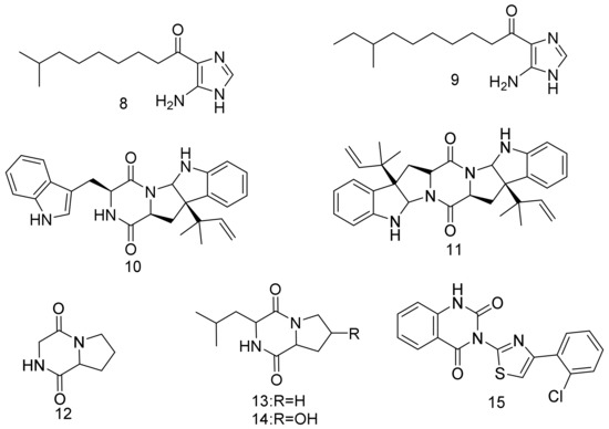 Chemical investigation of Nocardiopsis sp. (strain CNQ115) obtained from marine sediments collected from southern California coasts led to the isolation of nocarimidazoles A (8) and B (9) as two new 4-aminoimidazole alkaloids. Nocarimidazole A (8) showed weak antibacterial activities against Bacillus subtilis and Staphylococcus epidermidis, with MIC (minimum inhibitory concentration) values of 64 μg/mL [31]. Two diketopiperazines, (10) and (11), were isolated as SOAT2 (acyl-CoA:cholesterolacyltransferase (ACAT), EC 2.4.1.26) inhibitors from Nocardiopsis sp. KM2-16. The study on the cell-based assay showed that (11) selectively inhibited SOAT2 activity with a SI (selective index) value of 62. The strain Nocardiopsis sp. KM2-16 was isolated in 2012 from sea sediments collected off the coasts of Iriomote Island, Okinawa, Japan [32]. Three diketopiperazines (12–14) were isolated from Nocardiopsis umidischolae KMM 7036. Compound 13 had the strongest cytotoxicity on OSS (the fertility of spermatozoids) test and on the development of embryos of sea urchin (Strongylocentrotus intermedius). At the early blastula stage (5 h), compounds 12–14 did not affect fertilization and embryo development at a concentration of 100 µg/mL. Nevertheless, storage of the embryos in the presence of these compounds (up to 20 h) blocked the embryo development. This led to cell death and embryos lysis, mainly for (13). Compounds 12 and 14 showed cytotoxic activity against splenocytes [33]. A quinazoline derivative identified as 3-[40-(2″-chlorophenyl)-20-thiazolyl]-2,4-dioxo-1,2,3,4-tetrahydroquinazoline (15) was isolated from soil-derived Nocardiopsis alba that was collected from Western Ghat hills. The compound inhibited telomerases in a Telomeric Repeat Amplification Protocol (TRAP assay) in a cell-free system. Telomerase inhibitory activity was inferred from the reduction in the intensity of the telomerase-elongated TS primers, as compared to the band intensity of internal assay standard (TSNT). Compound 15 was thus suggested to be a suitable molecule for developing a future anticancer drug due to its selectivity towards G-quadruplex over normal DNA duplex and showing lower cytotoxicity for normal cells [34]. Structures are shown in Figure 2.