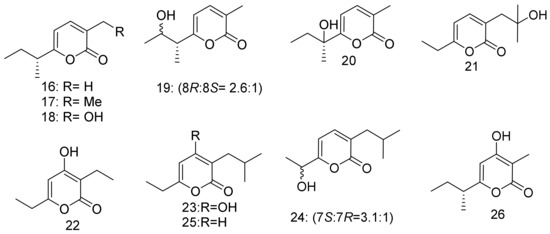 Eleven α-pyrones 16–26 (Figure 3) were isolated from three Nocardiopsis strains namely, SCSIO 04583, SCSIO 10419, and SCSIO KS107. Compounds 17, 19, 21, 24, and 25 displayed a moderate growth inhibition against Micrococcus luteus, while 16 and 25 showed mild inhibition against Bacillus subtilis. The marine- derived Nocardiopsis strains were cultivated from the reef sediment sample that was obtained from Xieyang Island, Beihai, Guangxi Province, China [35].