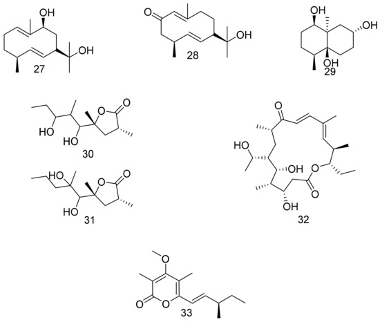9β-hydroxyl germacradienol (1(10)E,5E-germacradiene-9β,11-diol) (27) and 2-oxygermacradienol (11-hydroxy-1(10)E,5E-germacradien-2-one) (28) are two germacradiene-type sesquiterpenes isolated from Nocardiopsis chromatogenes YIM 90109 together with (1β,4β,4aβ,7α,8aα)-4,8a-dimethyloctahydronaphthalene-1,4a,7(2H)-triol (29) geosmin-type sesquiterpene. Nocardiopsis chromatogenes YIM 90109 is a halophilic strain obtained from a saline soil sample collected from Xinjiang Province, China. Compounds 27–29 were inactive as antibacterial in paper disc diffusion assay against the tested microbes at 30 μg/disc [36]. Lucentides A (30) and B (31) are polyketides that were isolated from Nocardiopsis lucentensis DSM 44048, together with 19-hydroxyprotylonolide (32) all of which had no antimicrobial activities against the tested strains [37]. Marinopyrone D (33) was identified from Nocardiopsis sp. strain CNQ-675, cultivated from the marine sediment obtained from La Jolla, California, and found to inhibit NO (nitric oxide) production with IC50 value of 13 µM. On the other hand, compound 33 had no significant antibacterial activity against a panel of tested Gram-negative and Gram-positive strains. Furthermore, compound 33 at concentrations up to 100 µM was nontoxic to the human renal carcinoma cell line (A498) and the human pancreatic cell lines (MIA-PaCa and PANC-1) [38]. Structures are shown in Figure 4.