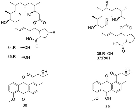 Borrelidins C–E (34–36), new 18-membered macrolides along with a previously reported borrelidin (37) were isolated from halophilic Nocardiopsis strain. Belonging to the rare borrelidin class of antibiotics, borrelidins C (34) and D (35) showed antibacterial activity against Salmonella enterica ATCC 14028, which is a Gram-negative pathogen with MIC values of 16 μM and 63 μM, respectively. Borrelidin C (34) displayed cytotoxic activity against SNU638 and K562 cell lines with IC50 values of 5.5 μM and 5.7 μM, respectively. Borrelidin D (35) showed comparable cytotoxicity against SNU638 and K562 with IC50 values of 8.7 μM and 6.7 μM, respectively, whereas borrelidin E (36) did not display cytotoxic activity against any of the tested cancer cell lines. The halotolerant Nocardiopsis strain was obtained from Jeung-do Island in Shinan-gun, Jeollanamdo, Korea from a hypersaline saltern topsoil samples [39]. A halophilic Nocardiopsis strain HR-4 was isolated from a soil sample that was collected from a salt lake in Algerian Sahara. 16S rDNA gene sequence analysis strongly suggests that Nocardiopsis strain HR-4 represents novel species. Bioactivity tests with extracts of strain HR-4 showed an antibacterial activity against namely S. aureus, E. faecalis, and M. luteus, as well as antifungal properties against S. cerevisiae and C. albicans. Chemical investigations led to the isolation and identification of two major angucyclinones, namely, 8-O-methyltetrangomycin (38) and (−)-7-deoxy-8-O-methyltetrangomycin (39) [40]. Structures are shown in Figure 5.