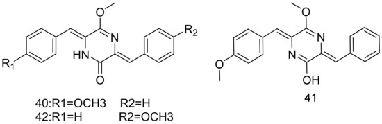 A cytotoxic compound isomethoxyneihumicin (40/41, Figure 6) that was isolated as a mixture of lactam-lactim tautomers together with methoxyneihumicin (42) was obtained from Nocardiopsis alba KM6-1. Isomethoxyneihumicin (40/41) and methoxyneihumicin (42) arrested the cell cycle of Jurkat cells in 12 h at the G2/M phase (66 and 67%) at concentrations of 15.0 μM. Both (40/41) and 42 displayed a cytotoxic activity in 20 h against Jurkat cells with IC50 values of 6.98 and 30.5 μM, respectively. These findings suggest that the exhibited cytotoxicity against Jurkat cells is by inhibiting the cell cycle at the G2/M phase. Nocardiopsis alba KM6-1 was isolated from the sea sediment samples from Chichijima, Ogasawara, Japan in 2013 [41].