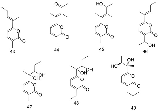 Nocapyrones O-S (44–48), along with nocapyrone F (43), are α-pyrones that were isolated from Nocardiopsis sp. YIMM13066 cultured from deep-sea sediment samples. None of the isolated α-pyrones showed any significant cytotoxic activity at 50 μM against PC3, H1299, HeLa, MCF-7, HL7702, and U251 cell lines [42].
