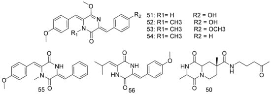 Nocarazepine A (50), which is a diketopiperazine, was purified from Nocardiopsis alba, which was cultured from Anthogorgia caerulea, that was obtained from the coast of Xieyang Island, Guangxi Province [44]. Six diketopiperazines, of which, two new nocazines F (51) and G (52), and four known (53–56) were identified from the deep-sea sediment derived Nocardiopsis sp. YIM M13066. Compounds 51 and 52 showed a broad spectrum and excellent cytotoxicity against human cancer cell lines PC3, H1299, HL7702, HeLa, MCF-7, and U251. The most potent was (52) against H1299 with IC50 2.60 μM and 51 against H1299 and MCF-7 with IC50 3.87 μM and 3.86 μM, respectively. Only (52) showed moderate antibacterial activity against B. subtilis ATCC 6051, with an MIC of 25.8 μM. Compounds 51–56 were assayed for inhibitory activity against T3SS (type three secretion system) of S. enteric serovar Typhimurium UK-1 χ8956. All of the compounds exhibited inhibitory activity at concentration of 100 μM against the secretion of SPI-1 effector SipA/B/C/D and no effects on FliC. Among them, compound 51 exhibited the strongest dose-dependent inhibition on the secretion of the SPI-1 effector SipC (from 5 to 100 μM) [45]. Structures are shown in Figure 8.