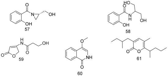 Nocardiopsis sp. NHF48 was isolated from the South China Sea sediments with anti-MRSA activity (MIC value: 12.5 µg/mL). Its chemical investigation led to the isolation of new α-pyrone (61) compound with anti-tumor (mouse melanoma cell line) activity (a GI50 value of 61.7 µg/mL) [48]. Structures are shown in Figure 9.