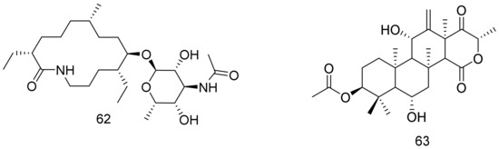A 14-membered macrolactam compound, fluvirucin B6 (62), was isolated from a marine-derived Nocardiopsis sp. CNQ-115. fluvirucin B6 (62) showed a weak growth inhibitory activity against Gram-positive bacteria i.e., Bacillus subtillis ATCC 6644, Kocuria rhizophila ATCC 9341, and Staphylococcus aureus ATCC 6538 P with MIC values of 64, 32, and 32 μg/L, respectively. Structures are shown in Figure 10. Whereas, it was inactive against the tested Gram-negative bacteria i.e., Salmonella typhimurium ATCC 14028, Escherichia coli ATCC 11775, and Klebsiela pneumoniae ATCC 4352 up to 128 μg/L [49]. Terretonin N (63), a rare tetracyclic 6-hydroxymeroterpenoid, was isolated from the ethyl acetate extract of a solid culture of Nocardiopsis sp. together with seven already known compounds i.e., 3-indole acetic acid, anthranilic acid, Nβ-acetyltryptamine, terrain, (3R,4R)-3,4-dihydroxy-3-methyl-pentan-2-one, (3S,4R)-3,4-dihydroxy-3-methyl-pentan-2-one, and sitosteryl-3β-d-glucoside . The strain Nocardiopsis sp. LGO5 was cultured from the sediment sample that was collected from a lake in Helwan, Egypt. Nocardiopsis sp. LGO5 extract displayed pronounced inhibitory activity against P. aeruginosa and S. cerevisiae; (13 and 14 mm, respectively). It showed low to moderate inhibition against E. coli DSMZ 1058, B. subtilis DSMZ 704, P. agarici DSMZ 11810, S. warneri DSMZ 20036, M. luteus DSMZ 1605, S. aureus, and C. albicans. Terretonin N (63) displayed distinct antibacterial activity (15mm) against Gram positive S. warneri, however, it showed only low activity (7–8mm) against the Gram negative P. agaraci and E. coli. Both terretonin N (63) and the bacterial extract did not show any significant in vitro cytotoxic activity against the human cervix carcinoma cell line KB-3-1 [50].