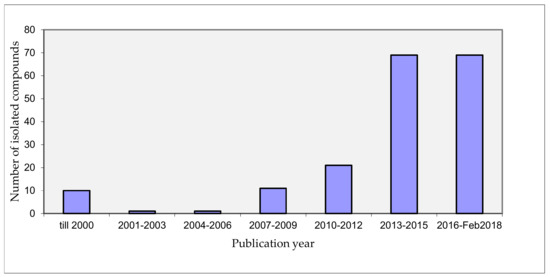 Natural products isolated from genus Nocardiopsis according to the year of publication.