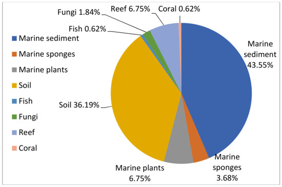 It is worth mentioning that the wide occurrence of the genus in diverse habitats (Figure 12) gives great potential for a broad structural, and thus functional, variety of the encoded secondary metabolites. While bioactive compounds were isolated from strains of both marine and terrestrial environments, marine sediments were the richest source of natural products (Figure 12). Almost 22 sequenced genomes from the genus Nocardiopsis are deposited so far in NCBI from various marine and terrestrial habitats [51,52,53,54]. The genomic screening and chemical investigation by chromatographic ways is the optimal approach for the prediction and rapid discovery of novel secondary metabolites from microbial strains, such as Nocardiopsis.