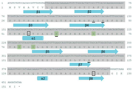 Nucleotide and deduced amino acid sequences of Paelopatides sp. copper, zinc superoxide dismutase (Ps-Cu,Zn-SOD). Conserved amino acid residues for Cu-binding are underlined, whereas residues for Zn-binding are shaded in green. Two cysteines predicted to form a disulfide frame are boxed. Cylinders and arrows represent helices and strands, respectively. The shaded part represents the predicted domain area.