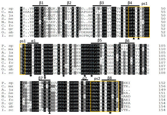Multiple alignment of Ps-Cu,Zn-SOD with other Echinodermata and invertebrates. Identities and similarities are shaded in black and gray, respectively. The predicted eight β-strands, two α-helices, and two sequences of Cu,Zn-SOD family (yellow box, ps1 and ps2) are shown above the alignment. Amino acids for Cu- and Zn-binding are indicated with triangles and asterisks. The two cysteines forming a disulfide bond are indicated with plus signs. Information on the species used for the alignment is given in Table 1.