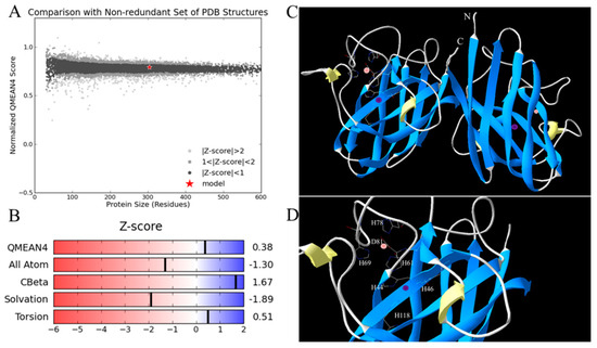 (A) Comparison of predicted structure with non-redundant set of PDB (Protein Data Bank) structures. The large black dots represent QMEAN Z-score between −1 and 1. The red star represents the model. (B) The four individual terms of the global QMEAN quality scores. (C) Predicted 3D structure of Ps-Cu,Zn-SOD using the Swiss model. Pink and purple spheres represent zinc and copper ions, respectively. The protein is a homodimer. N and C represent the N- and C-terminals of the polypeptide chain. (D) Close-up of the active sites.