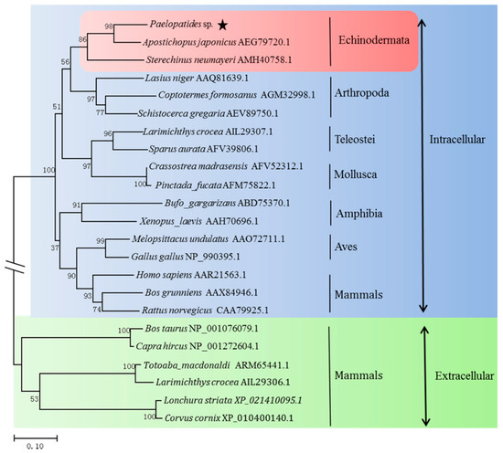 The phylogenetic tree was divided into two branches: intracellular Cu,Zn-SOD and extracellular Cu,Zn-SOD. The Ps-Cu,Zn-SOD belonged to the intracellular type as a monophyletic taxon and had the closest relationship with Apostichopus japonicus (98%). The Ps-Cu,Zn-SOD formed a branch with other Echinodermata and then formed a sister cluster with Arthropoda. Additionally, intracellular Cu,Zn-SOD of Echinodermata had a closer relationship with Teleotei and Mollusca, but was far from most vertebrates. Interestingly, the SOD sequences of the same taxonomic group clustered together and were in accordance with conventional taxonomy (Figure 4).