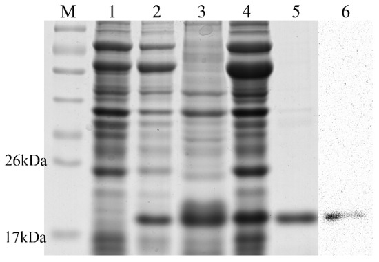 Analysis of the SDS-PAGE revealed that recombinant Ps-Cu,Zn-SOD was induced by 0.1 mM ITPG compared with the control (Figure 5, lanes 1 and 2) and exhibited a soluble expression in the supernatant (Figure 5, lane 4). The molecular mass of the recombinant protein was ~19 kDa, which was consistent with the estimated size of 18.23 kDa (Figure 5, lane 5). The protein yield was 1.91 mg/L culture. Protein purity was more than 95% (Figure 5, lane 5). The protein bands were then confirmed by Western blot analysis and all data indicated that Ps-Cu,Zn-SOD was successfully expressed and purified.