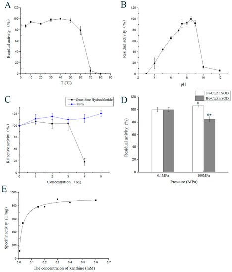 (A). Effect of temperature ranging from 0–80 °C on the enzyme activity. Each square in the graph represents the mean ± SD (n = 3). (B) Effect of pH on the enzyme activity. Tests were performed using different pH buffers ranging from 3.0–12.0 °C at 25 °C for 1 h. Each square in the graph represents the mean ± SD (n = 3). (C) Effects of denaturants on SOD activity. Values are mean ± SD of three separate replicates. The residual enzyme activity of the sample without denaturant was defined as 100%. (D) Effects of high hydrostatic pressure on SOD activity. Enzyme activity at 0.1 MPa at 5 °C was considered as 100%. Data are shown as mean values (n = 3) ± SD. (E) Michaelis-Menten equation of recombinant Ps-Cu,Zn-SOD. * p < 0.05; ** p < 0.01.