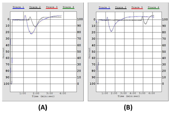 The hPRP was separated as previously described [] with some modifications. Briefly, for hPRP isolation, healthy human volunteers (n = 10) donated fasting blood samples. The Ethics Committee of the University of Limerick approved the protocol and it was performed in accordance with the Declaration of Helsinki. Healthy donors were fully aware that their blood samples were used in our study and written consent was provided to the specialised phlebotomist. A total of 50 mL of blood was collected from the median cubital vein or cephalic vein of each healthy volunteer via venepuncture using a 20 G safety needle, and blood was drawn into sodium citrate anticoagulant S-monovettes using the aspiration method (0.106 mol/L in a 1:10 ratio of citrate to blood; Sarstedt Ltd., Wexford, Ireland). The collected blood samples were centrifuged at 194 g for 18 min at 24 °C with no brake applied. The supernatant hPRP was then transferred to polypropylene tubes at room temperature for the aggregation bioassays, whereas platelet-poor plasma (PPP) was obtained by further centrifuging the specimens at 1465 g for 20 min 24 °C with no brake applied. hPRP was adjusted to 500,000 platelets/mL if required by addition of the respective volume of PPP according to the absorbance of the hPRP measured in the spectrophotometer. All procedures took place at 24 °C and all analyses were carried out within 2.5 h of the initial blood draw. PRP was stored at 24 °C before use in platelet aggregation bioassays.