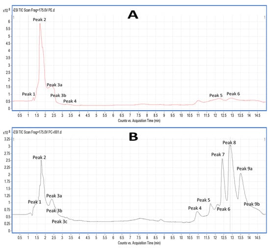 Salmon TPL and the most bioactive TLC fractions against the PAF pathway, PC and PE, were further analysed by LC-MS. Characteristic chromatograms of the HPLC separation (by using a C18 reversed phase column) for both PE and PC TLC fractions are depicted in Figure 3. The HPLC analysis of PE revealed 6 major peaks (Figure 3A), while the HPLC analysis of PC revealed 9 major peaks with specific retention times (Figure 3B). The HPLC was equipped with a Q-TOF mass spectrometer, therefore MS analysis was also conducted simultaneously with the HPLC separation for each one of these peaks. Thus, specific MS spectra were obtained for each peak and several structures for these PC and PE moieties are proposed. Characterisation of these molecules was based on the acquired m/z values of the negative ions [M − H]− for PE and the demethylated negative ions [M − CH3]− for PC [], and further verified by using the LIPID MAPS: Nature Lipidomics Gateway (www.lipidmaps.org), based on the lowest delta values during identification, in combination with their fatty acids contents that were acquired by both GC-MS and LC-MS analyses.