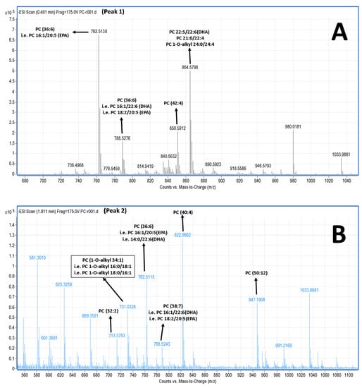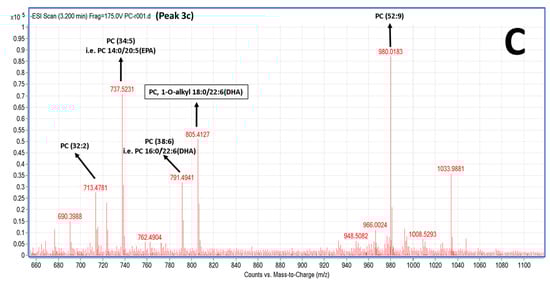 Interestingly, at peak 3c (elution time 3.2 min) of the HPLC analysis of the PC subclasses, a specific 1-O-alkyl-(18:0)-2-sn-akyl-(22:6, DHA)-3-PC, with theoretical mass of 819.61 (with a relative demethylated negative ion [M − CH3]− at 805,4 m/z) seems to be present in the PC TLC fraction of the salmon, which was bioactive against PAF. Taking into account that these fatty moieties seem to be present in this molecule and were also found within the most abundant molecules (18:0 fatty acid of the saturated ones and DHA (22:6) of the PUFA), by both GC-MS analyses (see Table 3) and LC-MS analyses of the salmon PL, this finding is in accordance with previously reported results of other bioactive lipid fractions in another fish species [], where it was also found that the lipid composition of these bioactive fractions contained various glycerophospholipid species, where the majority of them have either 18:0 or 18:1 fatty acids in the sn-1 position and either 22:6 or 20:2 fatty acids in the sn-2 position.