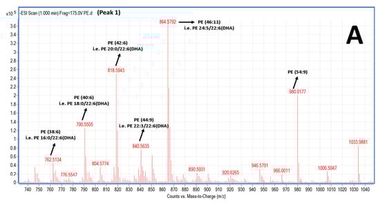 In the negative ion mode, survey scans between 600 and 1000 m/z of MS1 (Figure 5) also exhibited a specific pattern of molecular species for PE; it is proposed that many of these are diacyl-glycerol species containing either 16:0, 18:0, 20:0 fatty acids at the sn-1 position and mostly the 22:6 (DHA) fatty acid in the sn-2 position. Interestingly, 1-O-alkyl-2-sn-acyl-PE moieties also seem to be present, yet in less considerable quantities that are outlined in squares in Figure 5. PE species eluted in peaks 5–6, with higher retention times, seem to have longer more saturated carbon chains of their acyl-moieties (data not shown).