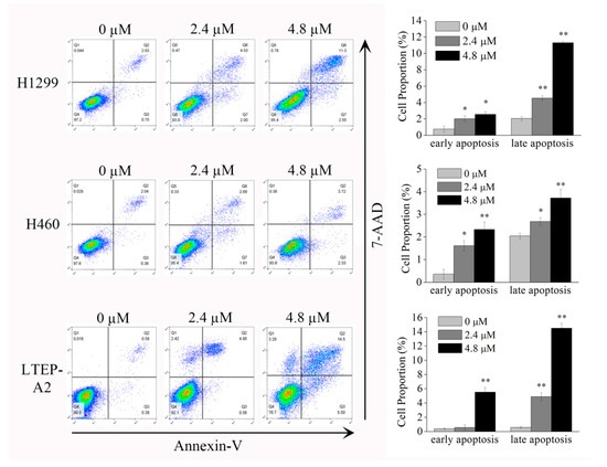 Phycocyanin induces apoptosis in NSCLC cells. H1299, H460, and LTEP-A2 cells were incubated with different concentrations of phycocyanin (0, 2.4, and 4.8 µM) for 48 h and subjected to apoptosis tests. The proportion of early apoptotic and late apoptotic cells were analyzed. Bars represent mean ± SD. *, p < 0.05; **, p < 0.01.