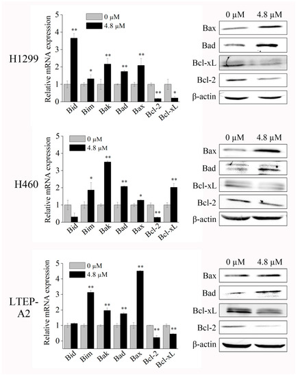 To gain a deeper insight into the mechanism of apoptosis induced by phycocyanin, we tested the expressions of apoptotic markers using quantitative real-time PCR (qRT-PCR) and Western blot. As shown in Figure 3, phycocyanin could significantly increase the transcriptional levels of pro-apoptotic genes Bim, Bak, Bax, and Bad, in addition to reducing the levels of Bcl-xL and Bcl-2, two anti-apoptotic genes in H1299 and LTEP-A2 cell lines. These results were further supported by Western blot analysis. It was interesting to find that in H460 cells, although the protein level of Bcl-xL was downregulated, its transcriptional level increased after phycocyanin treatment. In addition, the protein level of Bcl-2 showed no obvious alteration while its transcriptional level significantly decreased. These results indicated that a post-transcriptional mechanism might involve the regulation of these genes in H460 cells. Taken together, the above results suggested that phycocyanin could induce apoptosis in NSCLC cells.