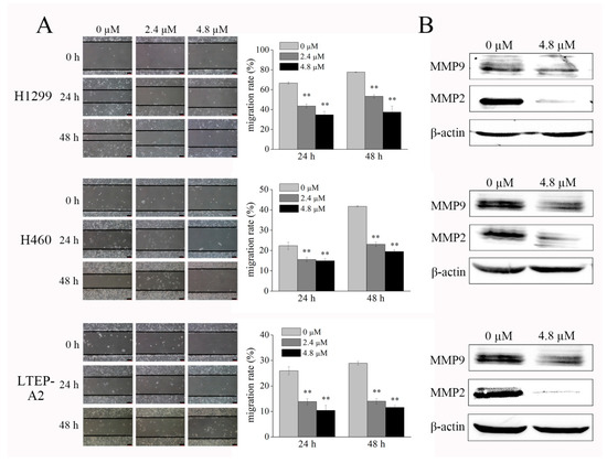 Phycocyanin displays anti-migratory effect against NSCLC cells. (A) The wound-healing assay showed representative effects of phycocyanin (0, 2.4, and 4.8 µM) on H1299, H460, and LTEP-A2 cell migration at 24 and 48 h. Quantification of wound closure was shown by histogram. Scale bars represent 100 µm. (B) Western blot analysis of MMP2 and MMP9 expression in NSCLC cells after 4.8 µM phycocyanin treatment for 48 h. MMP2, matrix metalloproteinase-2; MMP9, matrix metalloproteinase-9. Bars represent mean ± SD. **, p < 0.01.