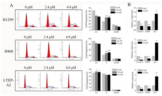 Phycocyanin induces cell cycle arrest in NSCLC cells. (A) Cell cycle analysis of NSCLC cells after treated with different concentrations of phycocyanin (0, 2.4, and 4.8 μM) for 48 h. (B) qRT-PCR analysis of the transcriptional levels of cell cycle regulatory genes at 24 h after phycocyanin treatment. Glyceraldehyde-3-phosphate dehydrogenase (GAPDH) was used as an internal control for normalization. Bars represent mean ± SD. *, p < 0.05; **, p < 0.01.