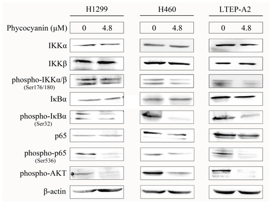 To investigate the underlying regulatory mechanism of phycocyanin in NSCLC cells, we determined the protein expressions of NF-κB signaling in H1299, H460, and LTEP-A2 cells after 4.8 μM phycocyanin treatment. IKKα and IKKβ served as the catalytic subunits of IκBα, an inhibitory protein of p65. Phosphorylation of IKKα/β could phosphorylate the IκBα protein at Ser32, resulting in the ubiquitin-mediated proteasome-dependent degradation of IκBα, followed by p65 phosphorylation and NF-κB activation [28]. As shown in Figure 7, although the total amounts of IKKα/β, IκBα, and p65 remained stable, their phosphorylation levels (phospho-IKKα/β-Ser176/180, phospho-IκBα-Ser32, and phospho-p65-Ser536) were significantly decreased after phycocyanin treatment, suggesting that the activity of NF-κB signaling was inhibited by phycocyanin. These results demonstrated that phycocyanin could significantly suppress the activity of NF-κB signaling in NSCLC cells. In addition, phycocyanin could also attenuate the phosphorylation levels of AKT in H1299, H460, and LTEP-A2 cells.