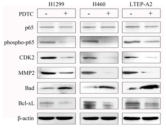 NF-κB signaling has regulatory effect on phenotypic factors of NSCLC cells. The protein expressions of phospho-p65, total p65, CDK2, MMP2, Bad, and Bcl-xL were analyzed by Western blot at 48 h in H1299, H460, and LTEP-A2 cells after 10 μM PDTC treatment for 24 h. PDTC, pyrrolidine dithiocarbamate.