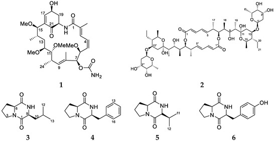 A new approach utilising two-dimensional heteronuclear single quantum coherence—total correlation spectroscopy nuclear magnetic resonance (HSQC-TOCSY NMR) profiles and biological activity data [10] allowed us to target antiplasmodial polyketide-producing strains based on identified regions of interest in the NMR spectrum that corresponded to correlations between upfield methyl proton resonances (δH 0.50–2.00) and carbon resonances between δC 60–80 ppm, which were associated with polyketide-type compounds. Based on this approach, Streptomyces sp. (USC-16018) derived from the colonial ascidian Symplegma rubra was selected because its crude extract HSQC-TOCSY NMR profile indicated the presence of several polyketide resonances (Supplementary Material, Figure S1). Furthermore, the extracts exhibited a 97% inhibition of Plasmodium falciparum at 0.2 μg/mL. The Streptomyces sp. was fermented on a larger scale and the purification of the ethyl acetate (EtOAc) extract derived from this culture resulted in the isolation of two antiplasmodial polyketides, herbimycin G (1), a new geldanamycin analogue, and the known antibiotic elaiophylin (2), as well as four known diketopiperazines (3–6) (Figure 1).