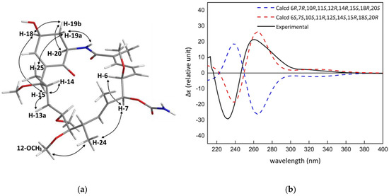 Further strong correlations between H-18 and H-19b (δH 2.26) to H-20 (δH 4.55), indicated their position to be on the α-face. The hydroxyl group, H-19a (δH 1.96), and the amide proton (δH 8.02) faced in the β-direction. No COSY correlation was observed between H-17 and H-18, indicating that the two protons were at an angle close to 90° and the small long-range couplings (J = 1.8 Hz) between H-17 and H-19b suggested a “W” arrangement. The ROESY correlations between the methyl resonating at δH 0.69 and δH 1.96 indicated that the macrolactam folded over the 4-hydroxyl-cyclohexenone. The two-dimensional structure was therefore established and redrawn in Maestro 2016 (Maestro Technologies, Inc., Trenton, NJ, USA) to perform a Monte-Carlo Multiple Minimisation (MCMM) search using the OPLS2005 force field (Schrödinger, New York, NY, USA) to generate the energy minimised conformation of 1 (Figure 2a). The previously observed ROESY correlations were compared to the energy-minimised 3D structure of 1, confirming its relative configuration. The absolute configuration of 1 was determined by comparison of its experimental and predicted electronic circular dichroism (ECD) spectra, calculated using time-dependent density functional theory (TDDFT). A conformational search using MacroModel (Version 10.8, Schrödinger, LLC, New York, NY, USA) was performed on the energy minimised structure of 1 using the force field parameters as above with extended torsional sampling options. All structures within a 10.0 kJ/mol energy window were saved, generating 13 conformers. Geometry optimisation and Gibbs free energy calculations using Gaussian 16 (Revision A.03, Gaussian, Inc., Wallingford, CT, USA) at the B3LYP/31G(d) energy level was then performed on each of the conformers. Following this, the ECD spectra of each of the geometry optimised conformers was calculated using Gaussian 16 at the same theoretical level. A Boltzmann-weighted ECD spectrum was then calculated using SpecDis (Version 1.7, Würzburg, Germany) The experimental ECD spectrum of 1 showed good agreement with the calculated ECD of (6S,7S,10S,11R,12S,14S,15R,18S,20R)-1 (Figure 2b).