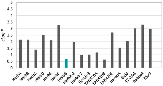 The analysis of the cLogP values of herbimycins and related ansamycin compounds (note: structures and keys for abbreviations for the presented compounds are given in the Supplementary Material Table S1 and Figure S2).
