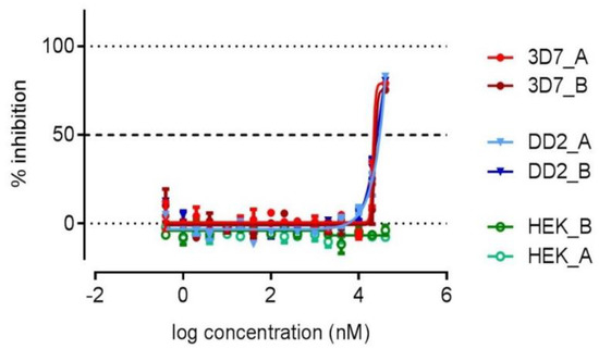 P. falciparum parasites (3D7 and Dd2 strains) were grown in RPMI 1640 supplemented with 25 mM HEPES, 5% AB human male serum, 2.5 mg/mL Albumax II, and 0.37 mM hypoxanthine. The parasites were subjected to two rounds of sorbitol synchronization before undergoing compound treatment. The ring stage parasites were exposed to the experimental compounds in 384-wells imaging microplates (PerkinElmer CellCarrier, Waltham, MA, USA), as previously described in Reference [32]. The plates were incubated for 72h at 37 °C, 90% N2, 5% CO2, 5% O2, then the parasites were stained with 2-(4-amidinophenyl)-1H–indole-6-carboxamidine (DAPI), and imaged using an Opera QEHS micro-plate confocal imaging system (PerkinElmer, Waltham, MA, USA). The images were analysed as previously described in Reference [32].