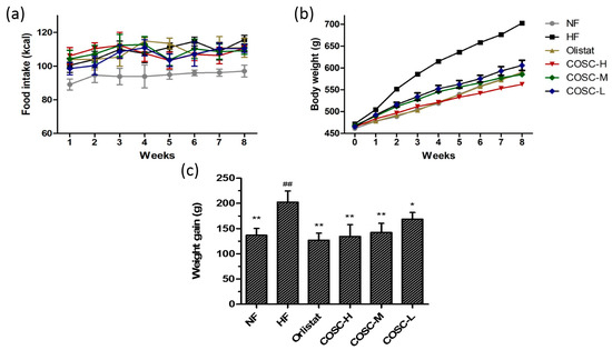 To evaluate the anti-obesity effects of COSCs, food intake, body weight, and the body weight gain of the rats were measured over an eight-week period, the results of which are shown in Figure 1. For food intake, the high-fat (HF) group was slightly higher than the normal diet group (NF) and treatment groups during the experimental period, but the difference was not significant (Figure 1a), suggesting no influence of COSCs on the appetite of the rats, and the minor decrease of food intake in the treatment groups was attributed to a slight anorectic effect induced by HFD during the long-term HFD intake [10].