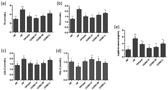 COSCs corrected serum lipid and leptin levels of high-fat diet (HFD)-induced obese rats. Serum TC (a); TG (b); LDL-C (c); HDL-C (d); and leptin (e) levels after eight weeks of treatment are shown. The data are expressed as means ± SE (n = 10). Note: * p < 0.05, ** p < 0.01 when compared to the HF group; # p < 0.05, ## p < 0.01 when compared to the HF group.