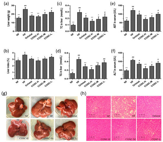The liver morphology, lipids, AST, and ALT levels are shown in Figure 3. Compared with the NF group, the average liver weight of rats fed HFD increased by 66.06%, which could be decreased by 13.55~33.12% after the administration of COSCs (Figure 3a). The corresponding results were also shown on the liver index (liver mass/body mass); that of the HF group was 30.50% higher than that of the NF group, although it could be decreased by 13.55~33.12% after the administration of COSCs (Figure 3b). For the liver TC (Figure 3c) and TG (Figure 3d) levels, the significant increases by 67.07% and 71.98% in the HF group were respectively shown when compared with that in the NF group, suggesting an obvious liver lipid accumulation induced by HFD. However, after the administration of Orlistat and the different doses of COSCs, the HFD-induced high levels of TC in the liver were significantly decreased by 29.35% (Orlistat), 46.34% (COSC-H), 35.93% (COSC-M), and 24.13% (COSC-L), and the levels of TG in the liver were also markedly decreased by 37.22% (Orlistat), 51.87% (COSC-H), 31.77% (COSC-M), and 17.63% (COSC-L).