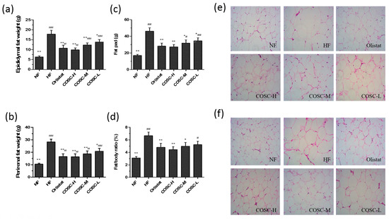 After the eight-week administration, the epididymal and perirenal WAT weights were measured to calculate the wet weight of the fat pad and fat/body ratio (Figure 4). Compared to the NF rats, the average weights of epididymal (Figure 4a) and perirenal WAT (Figure 4b) in the HF group were markedly increased by 64.38% and 63.19%. Also, COSCs were found to decrease the fat pad (Figure 4c, p < 0.05) and fat/body ratio (Figure 4d, p < 0.05) of rats dose-dependently to the normal range. Moreover, the inhibiting effects of COSC-H on HFD-induced elevated fat pad and fat/body ratio were slightly superior to that of Orlistat.