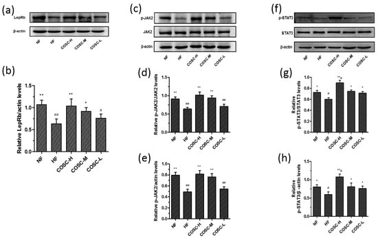 COSCs activated the JAK2-STAT3 signaling transduction of obese rats. Protein expression and quantification of LepRb (a,b); phosphorylation of JAK2 (p-JAK2, c–e) and phosphorylation of STAT3 (p-STAT3, f–h) in liver are shown here. The data are expressed as means ± SE (n = 10). Note: compared with rats in the HF group, * p < 0.05, ** p < 0.01; compared with rats in the NF group, # p < 0.05, ## p < 0.01.