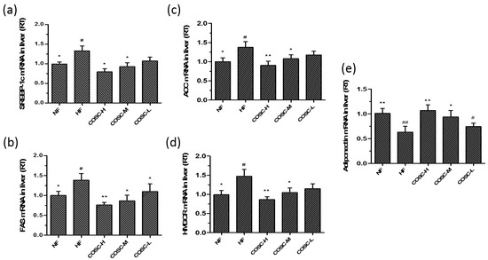COSCs regulated the expression of liver lipogenesis-related genes in obese rats. The liver mRNA levels of SREBP-1c (a); FAS (b); ACC (c); HMGCR (d); and adiponectin (e) were detected by Q-PCR. ∆Ct is the average value of 10 samples in the formulation (average mRNA expression of experiment groups/average mRNA expression of the NF group) = 2−∆∆Ct = 2(−∆Ct control −∆Ct FF). If 2−∆∆Ct < 1, the average mRNA expression of the experiment groups is lower than that in the NF group. If this value is higher than 1, the average mRNA expression of the experiment groups is higher than that in the NF group. The data are expressed as means ± SE (n = 10). Note: compared with rats in the HF group, * p < 0.05, ** p < 0.01; compared with rats in the NF group, # p < 0.05, ## p < 0.01.