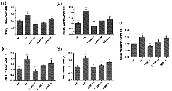 COSCs regulated the expression of lipogenesis-related genes in obese rat WAT. The mRNA levels of PPARγ (a); C/EBPα (b); ADRP (c); FAS (d); and SREBP-1c (e) in epididymal adipose tissues were quantified by Q-PCR. The 2−∆∆Ct method was used for the quantification of each mRNA as shown in Figure 6. The data are expressed as means ± SE (n = 10). Note: compared with rats in the HF group, * p < 0.05, ** p < 0.01; compared with rats in the NF group, # p < 0.05, ## p < 0.01.