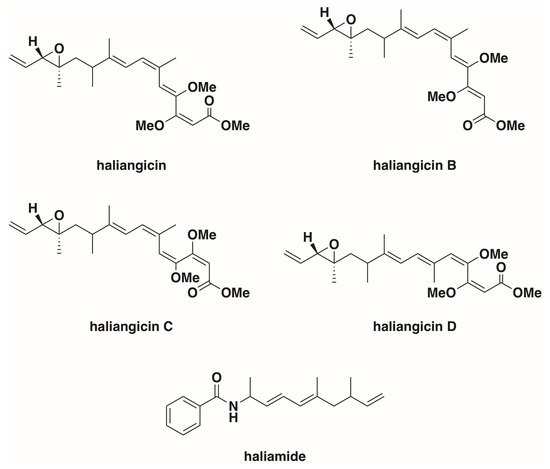 Haliangium ochraceum secondary metabolites [35,36,37,38]. Of note, cis isomers about the epoxide moiety have also been reported for all of the haliangicins [37].