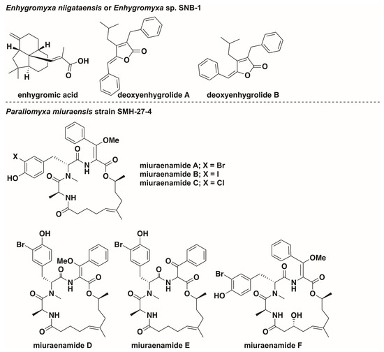 - Tomura, T.; Nagashima, S.; Yamazaki, S.; Iizuka, T.; Fudou, R.; Ojika, M. An Unusual Diterpene-Enhygromic Acid and Deoxyenhygrolides from a Marine Myxobacterium, Enhygromyxa sp. Mar. Drugs 2017, 15, 109. [Google Scholar] [CrossRef] [PubMed]