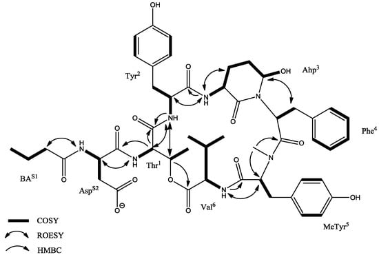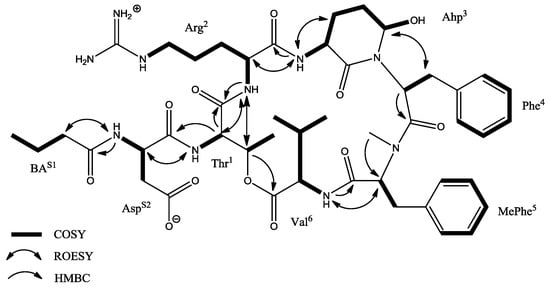 The COSY, TOCSY, and HMBC data allowed identification of amino acid residues in CP CP962 as Asp, Thr, Arg, Ahp, Phe, MePhe (N-methyl phenylalanine), Val, and BA, analogously to CP985 (Table 4, Figures S19–S24b). Two aromatic residues were found: phenylalanine and N-methyl phenylalanine. The occurrence of N-methyl group was established by the 1H-13C long range correlation from MePhe-NH-CH3 group (δH 2.84 ppm) to the MePhe-C2 atom. The typical 13C chemical shift of the guanidine quaternary carbon (δC 158.7 ppm) indicated the presence of Arg whose complete spin system was assigned based on TOCSY and COSY interactions (Figure S23b). The diagnostic regions of the TOCSY, ROESY and HMBC spectra of both cyanopeptolins analyzed are presented in corresponding figures in Supplementary.
