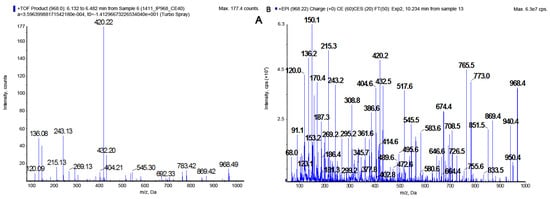 The product ion mass spectra of CP985 [Thr+Tyr+Ahp+Phe+MeTyr+Va]Asp+BA with precursor ion [M + H − H2O] at m/z 968. The spectra were recorded with application of a hybride quadrupole/time-of-flight mass spectrometer (QTOF) (A) and a hybride triple quadrupole/linear ion trap mass spectrometer (QTRAP) (B). The mass signals were assigned to the following fragments: 950 [M + H − 2H2O]+, 869 [M + H − Val − H2O]+, 851 [M + H − Val − 2H2O]+, 773 [M + 2H − (BA+Asp) − CO]+, 765 [M + 2H − (BA + Asp) − 2H2O]+, 692 [M + H − (Val + MeTyr) − H2O]+, 674 [M+H−(Val+MeTyr)−2H2O]+, 646 [M + H − (Val + MeTyr) − 2H2O − CO]+, 432 [M + H − (Val + MeTyr + Phe + Ahp) − H2O]+, 420 [Ahp + Phe + MeTyr + H − H2O]+, 404 [M + H − (Val + MeTyr + Phe + Ahp) − H2O − CO]+, 386 [BA + Asp + Thr + Val + H]+, 308 [Phe(−N) + MeTyr + H]+, 297 [Asp + Thr + Val + H − H2O − CO]+, 243 [Ahp + Phe + H − H2O]+, 215 [Ahp + Phe + H − H2O − CO]+, 150 MeTyr immonium ion, 136 Tyr immonium ion, 120 Phe immonium ion.