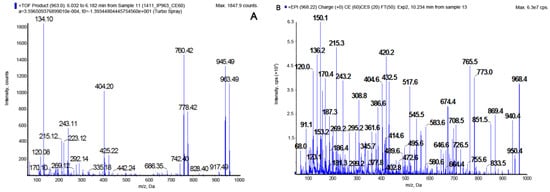 The product ion mass spectra of CP962 [Thr+Arg+Ahp+Phe+MePhe+Val]Asp+BA with precursor ion [M + H]+ at m/z 963. The spectra were recorded with application of a hybride quadrupole/time-of-flight mass spectrometer (QTOF) (A) and a hybride triple quadrupole/linear ion trap mass spectrometer (QTRAP) (B). The mass signals were assigned to the following fragments: 945 [M + H − H2O]+, 917 [M + H − H2O − CO]+, 846 [M + H − Val − H2O]+, 828 [M + H − Val − 2H2O]+, 778 [M + 2H − (BA + Asp)]+, 760 [M + 2H − (BA + Asp) − H2O]+, 742 [M + 2H − (BA + Asp) − 2H2O]+, 685 [M + H − (Val + MePhe) − H2O]+, 425 [BA + Asp + Thr + Arg + H − H2O]+, 404 [Ahp + Phe + MePhe + H − H2O]+, 297 [Asp + Thr + Val + H − H2O]+, 243 [Ahp + Phe + H − H2O]+, 215 [Ahp + Phe + H − H2O − CO]+, 134 MePhe immonium ion, 120 Phe immonium ion, 70-Arg.