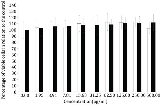 For the test, two CPs were selected: Arg2-containing CP962 and Tyr2-containing CP985. MCF-7 breast cancer cells were seeded at 7.5 × 103 cells/100 μL in a 96-well plates and incubated at 37 °C, 5% CO2 for 24 h. The cells were then treated for a further 24 h with CP962 and CP985 (0 to 500 μg/mL). After 24 h, sterile-filtered 3-(4,5-dimethylthiazol-2-yl)-2,5-diphenyltetrazolium bromide solution (MTT; 1 mg/mL) was added to each well. After 4 h incubation at 37 °C in the dark, the MTT solution was removed and formazan crystals solubilized in DMSO. The plates were shaken for 20 min, in the dark, at room temperature and absorbance was measured at 560 nm (Synergy/HT, BIOTEK, Wnooski, VT, USA). For each CP, three independent experiments were carried out and each treatment consisted of six replicates per plate. Bar charts were used to represent the viability of MCF-7 cells treated with CP962 and CP985, compared to the control (i.e., untreated cells) that represented 100% cell viability.