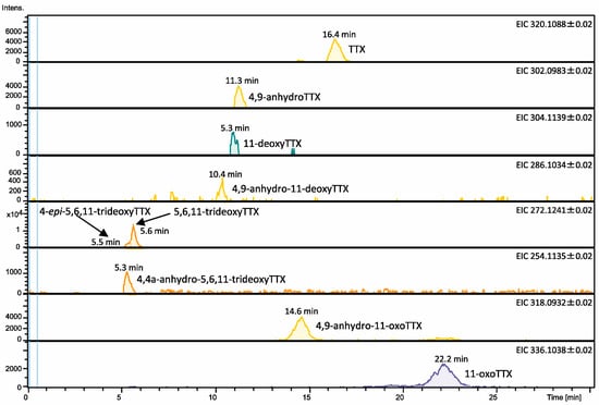 Liquid chromatography-mass spectrometry (LC-MS) chromatograms (EICs) of TTX and its analogues bound to the plasma proteins of A. manilensis, which were analyzed in their unbound forms following dissociation from the proteins fraction under acidic conditions. Calculated amounts of TTXs on the column: TTX (0.16 ng), 4,9-anhydroTTX (0.10 ng), 11-deoxyTTX (0.01 ng), 4,9-anhydro-11-deoxyTTX (0.01 ng), 4-epi-5,6,11-trideoxyTTX (0.07 ng), 5,6,11-trideoxyTTX (0.27 ng), 4,4a-anhydro-5,6,11-trideoxyTTX (0.02 ng), 4,9-anhydro-11-oxoTTX (0.19 ng), and 11-oxoTTX (0.17 ng). LC-MS conditions are same as previously reported [].