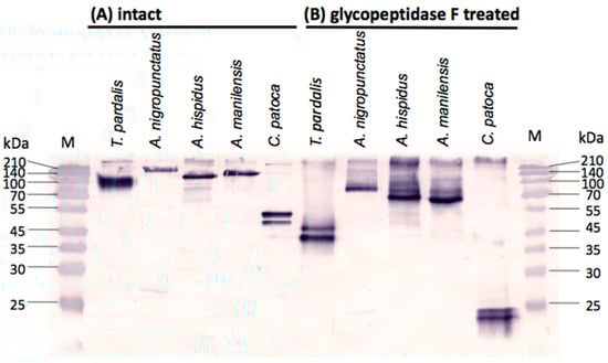 Intact and deglycosylated pufferfish plasma following reaction with glycopeptidase F were analyzed for the presence of PSTBP-like proteins using Western blots with the anti-PSTBP antibody (anti-deglycosylated PSTBP, IgG fraction) that we had previously prepared []. We first confirmed that the plasma from two or three specimens of each species of A. nigropunctatus, A. hispidus, A. manilensis, and C. patoca exhibited the same species-specific bands, after which the plasma from one specimen of each species was examined by Western blot analysis.