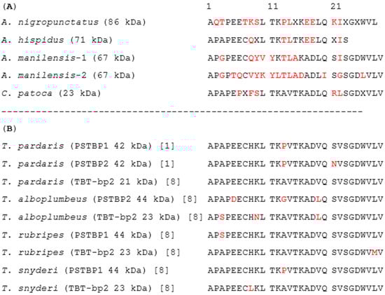 (A) Alignments of deduced N-terminal amino acid sequences of PSTBP-like proteins from the intact blood plasma of A. nigropunctatus, A. manilensis, A. hispidus, and C. patoca examined in this study with the molecular masses of their protein components; and (B) N-terminal amino acid sequences of the reported PSTBP and TBT-bp2 in Takifugu spp. with the molecular masses of their protein components deduced by cDNA sequences [,]. X denotes an amino acid that was not determined. The amino acid residues different from the major one are colored in red.