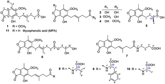 Compounds 1–2 and 8–11 were identified as 8-O-methyl mycophenolic acid (1) [16], 3-hydroxy mycophenolic acid (2) [16], N-mycophenoyl-l-valine (8) [8], N-mycophenoyl-l-phenyloalanine (9) [8], N-mycophenoyl-l-alanine (10) [8], and MPA (11) [17] by comparison of their NMR data and specific rotations with those reported in the literature. Moreover, their structures were confirmed by 1H–1H COSY and HMBC correlations (for detailed structural determination, please see the Supporting Information).